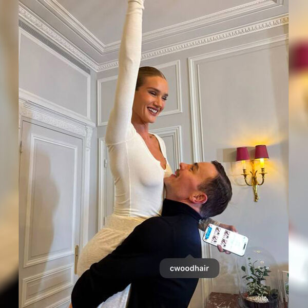 Рози Хантингтон-Уайтли позировала в серых джоггерах и белом лонгсливе с глубоким декольте. Волосы она уложила в хвост и сделала легкий макияж. Модель держал на руках ее стилист по волосам. Перед камерой модель улыбалась и поднимала руки вверх.