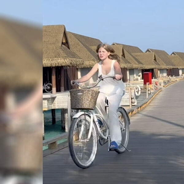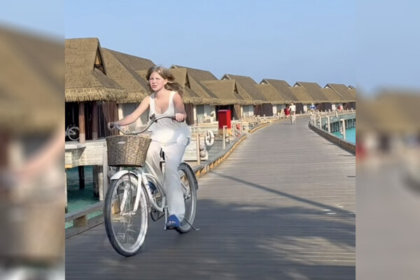 Юлия Пересильд показала, как дочь Мария в черных шортах и белой футболке ездила на велосипеде по набережной вдоль отелей на Мальдивах.