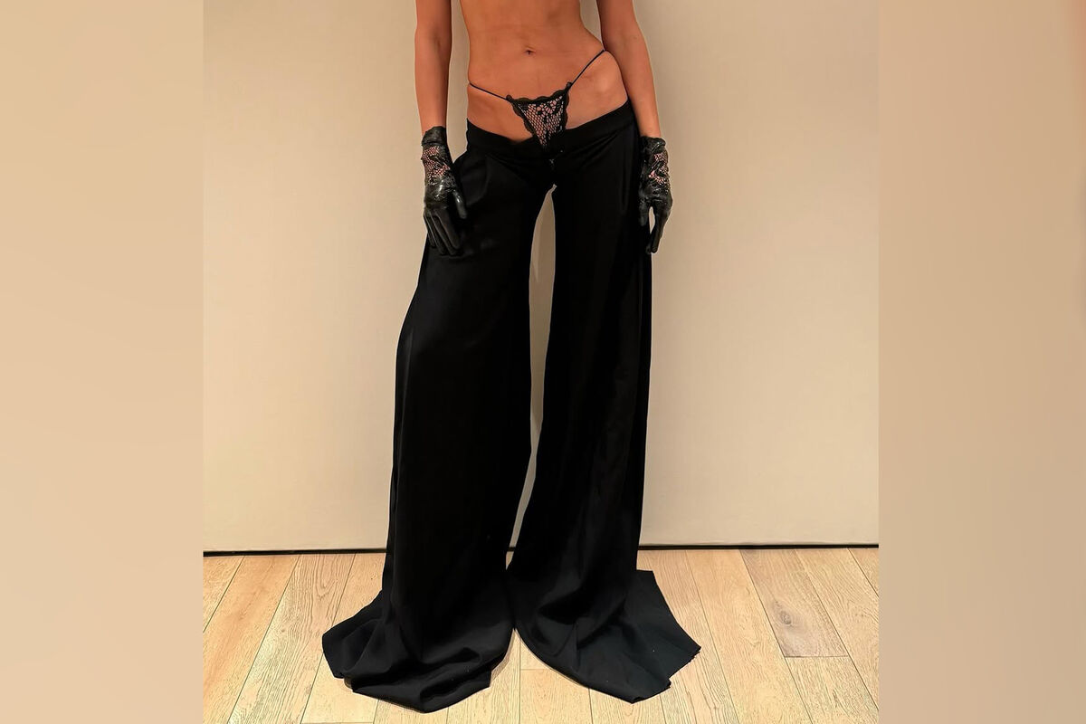39-летняя Ирина Шейк стояла перед зеркалом в черных прозрачных стрингах, приспустив широкие брюки в тон. Супермодель также надела кожаные перчатки с кружевом.