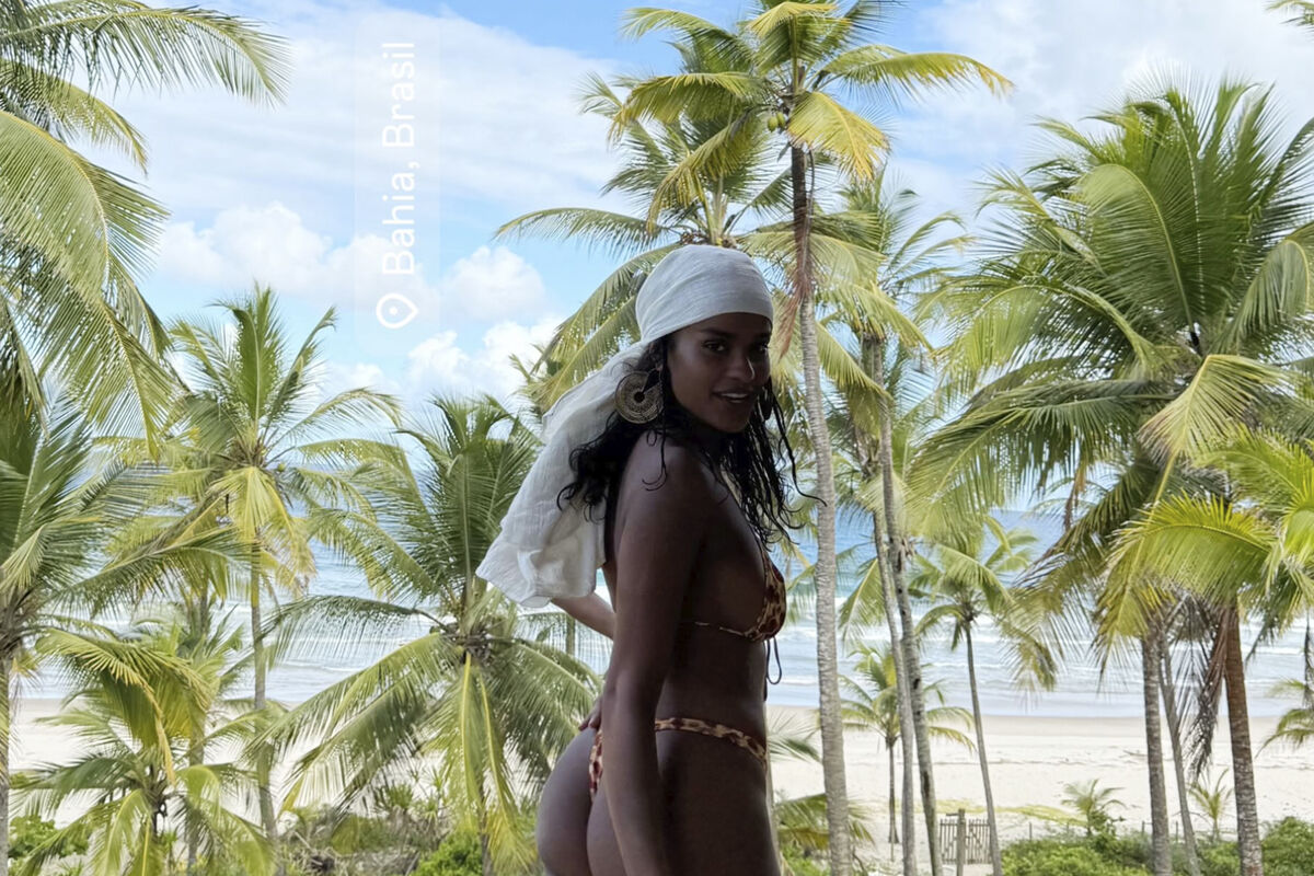 28-летняя Нара Баптиста позировала перед камерой в леопардовом крошечном бикини, которое дополнила белым платком на голову и массивными серьгами. Модель была запечатлена с распущенными волосами и без косметики. Манекенщица стояла на фоне тропиков.