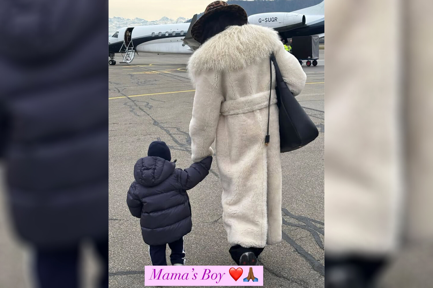 На снимке 54-летняя Наоми Кэмпбелл была запечатлена вместе с ребенком на фоне гор. Супермодель держала мальчика за руку и вела к самолету. Звезда подиумов появилась на публике в светлой длинной шубе, леопардовой шляпе, черных трениках и кроссовках. Ребенок был одет в темно-синюю куртку, спортивные брюки с лампасами, кроссовки и шапку.