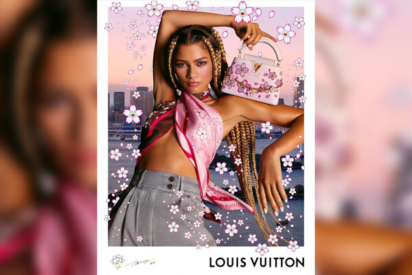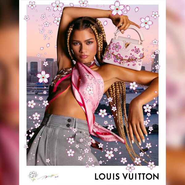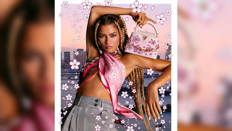 28-летняя Зендая стала лицом рекламной кампании коллаборации Louis Vuitton и японского художника Такаси Мураками. Актриса позировала в розово-шоколадном платке с цветочным принтом, который повязала как топ. При этом артистка не стала надевать бюстгальтер. Знаменитость добавила к образу серые джинсы с завышенной талией и нежно-розовую сумку с цветочной вышивкой. Стилист заплел актрисе косы, а визажист сделал макияж.