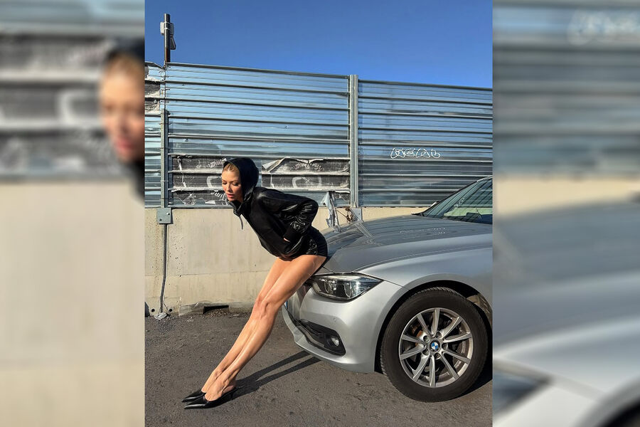 Модель Лена Перминова в кожаных шортах снялась на капоте машины
