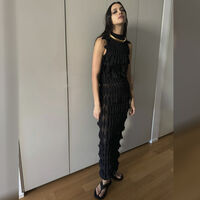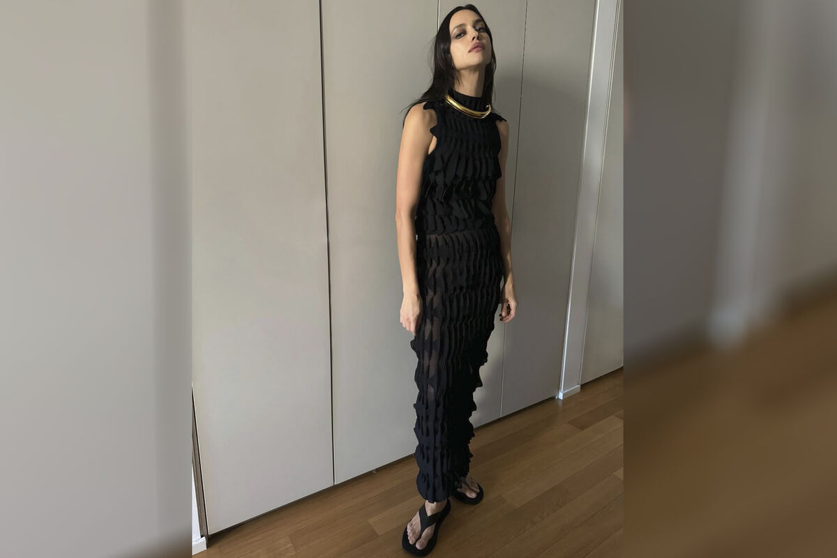 39-летняя Ирина Шейк предстала перед камерой в черном облегающем полупрозрачном макси-платье. Супермодель дополнила свой образ массивным золотым украшением на шее и кожаными сланцами. Манекенщице сделали макияж с темными тенями и розовой помадой. Она позировала с распущенными волосами.