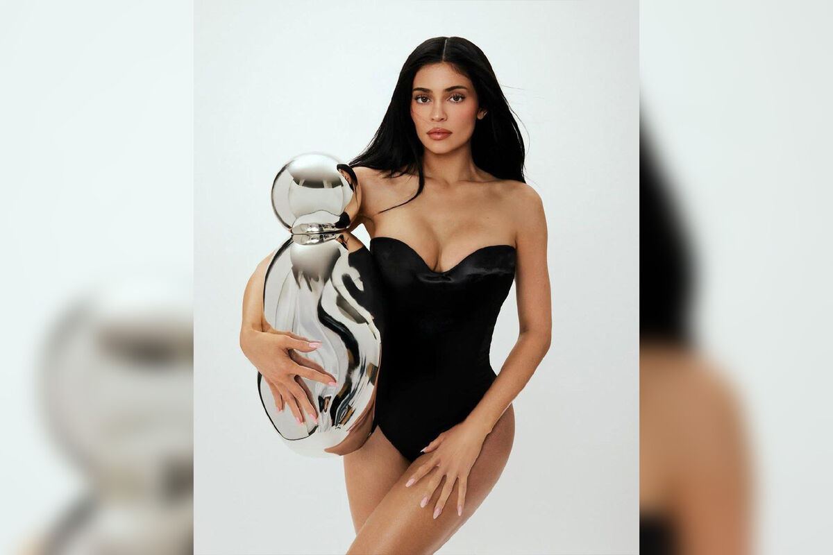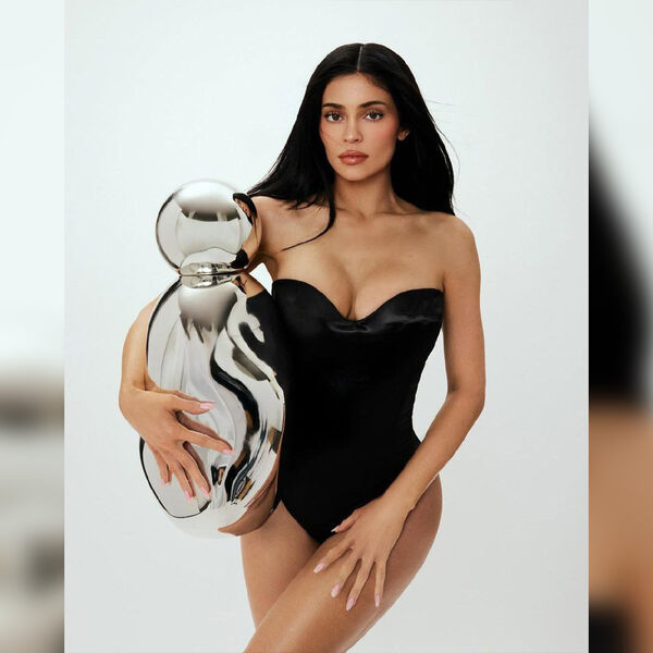 Кайли Дженнер показала фигуру в черном бархатном боди с глубоким декольте. Волосы ей уложили прядями и сделали вечерний макияж. В руках она держала серебряный флакон с новым парфюмом.