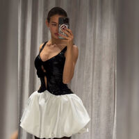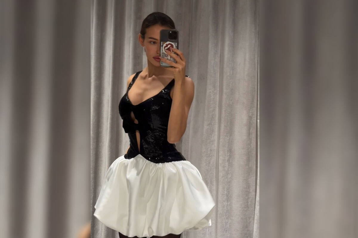 Валентина Иванова позировала в черном мини-платье с декольте до живота и акцентной белой пышной юбкой. Волосы она собрала в пучок и сделала легкий макияж.