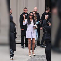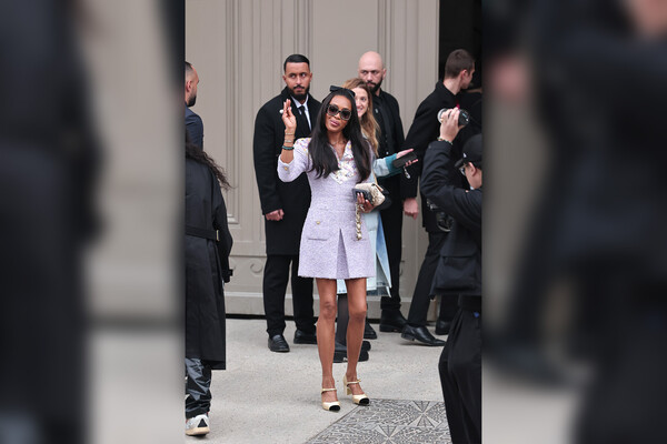 54-летняя Наоми Кэмпбелл появилась на показе Chanel, который прошел 11 марта на Неделе моды в Париже. Супермодель позировала перед фотографами в лиловом твидовом мини-платье с V-вырезом и атласных светлых туфлях с черным мысом на маленьких каблуках. Манекенщица добавила к наряду черный бант, солнцезащитные очки, сумку и множество браслетов. Знаменитости уложили волосы и сделали макияж в естественном стиле.