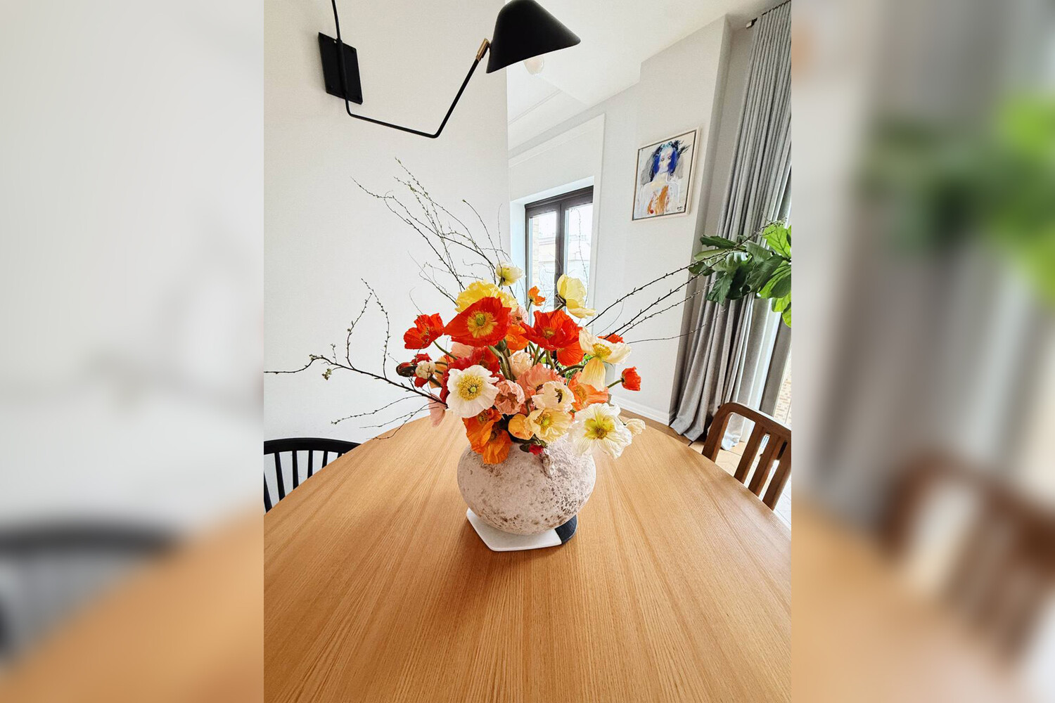 Александр Рогов показал интерьер гостиной в новой квартире в Москве. В центре стоял деревянный стол, а на нем — керамическая ваза с цветочным букетом. На стенах висели картины и лампы.