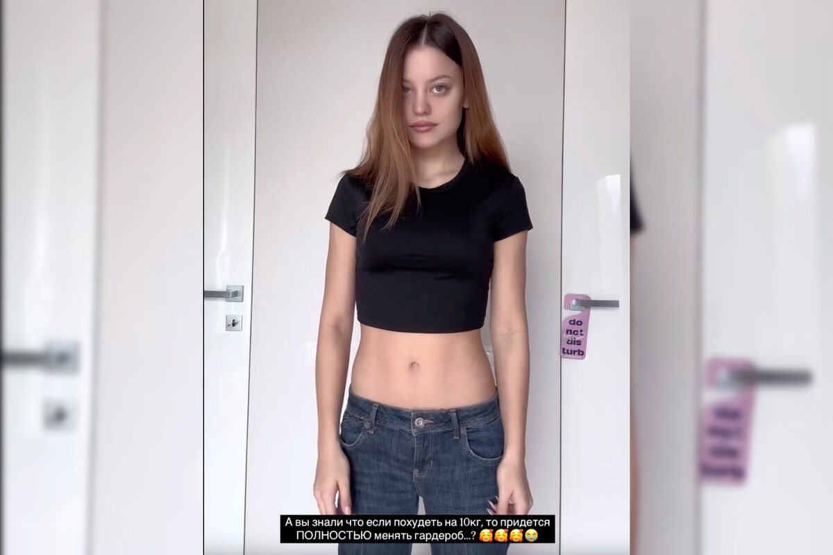 Дилара Зинатуллина пожаловалась, что ей стали не подходить старые вещи. В ролике блогерша стояла в черном топе и примеряла разные модели джинсов.