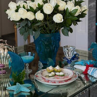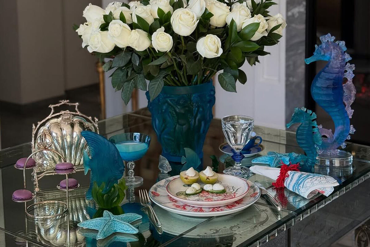 Рудковская украсила стол морскими коньками из хрусталя от бренда Lalique за 40 тысяч рублей и рыбками-фигурами. На стол она также поставила посуду от Dior и бокалы от Baccarat. В вазу в морском стиле она поставила белые розы.