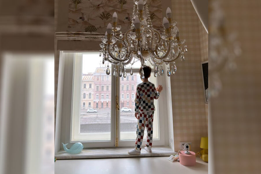 Татьяна Брухунова поделилась фото из детской комнаты, оформленной в светлых оттенках с жирафом на стене. Из окна открывался вид на один из каналов в Санкт-Петербурге. Мальчик стоял на подоконнике и любовался видом.