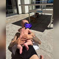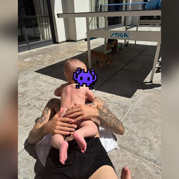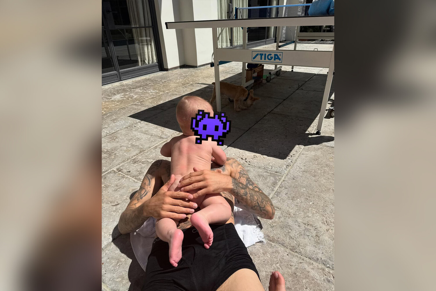 На одном из кадров Джастин Бибер лежал на полу на веранде и придерживал сына Джека Блюза, который ползал по нему. Певец был запечатлен в черных трусах-боксерах без футболки. Поп-исполнитель прикрыл лицо ребенка смайликом.