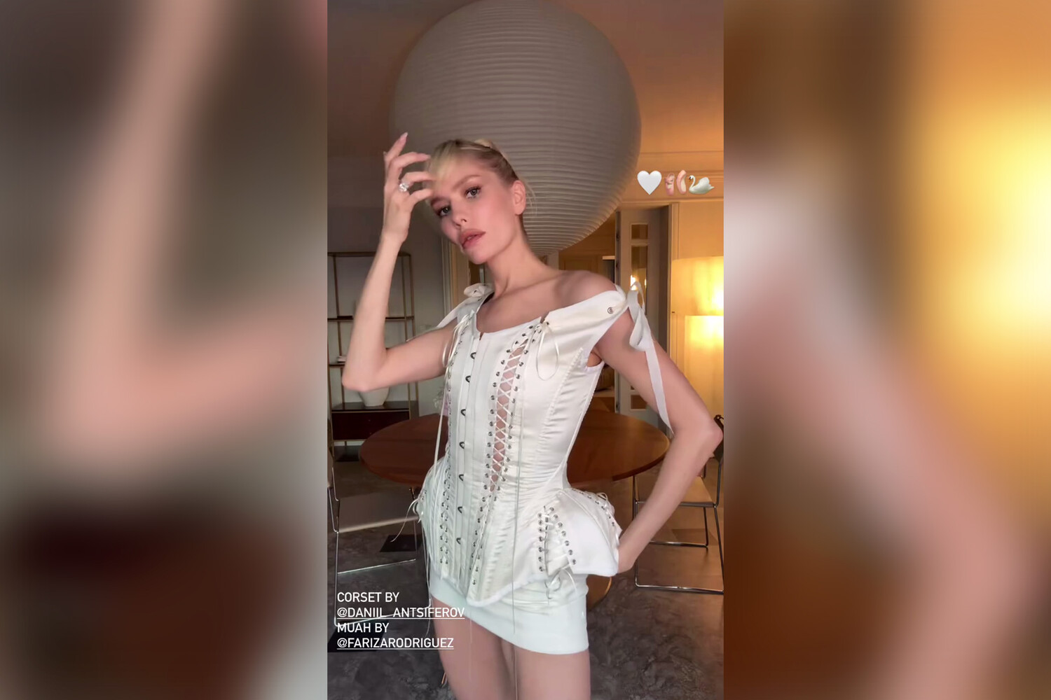Елена Перминова снялась в белом корсетном мини-платье с разрезами по бокам. Волосы ей собрали в высокий пучок и выпустили челку, а также сделали легкий макияж.