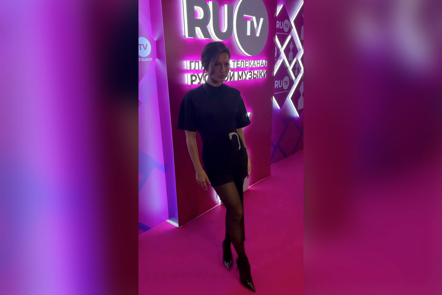 34-летняя Нюша пришла на pre-party премии телеканала RU.TV, которое прошло 9 апреля в Москве. Певица позировала перед фотографами в черном облегающем мини-платье с короткими рукавами и блестящей массивной брошью. Поп-исполнительница также надела капроновые колготки и туфли на каблуках. Артистке собрали волосы в пучок с прядями у лица и сделали макияж с угольно-черными стрелками, контурингом и нюдовой помадой.