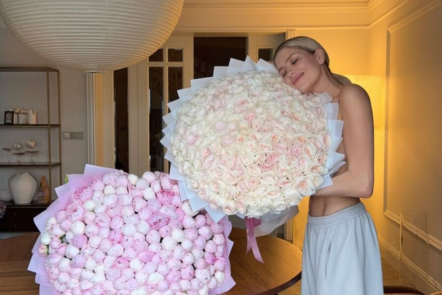 38-летняя Елена Перминова позировала в серых спортивных штанах с собранными в хвост волосами и без макияжа. Модель держала в руках большой букет белых роз, а рядом на обеденном столе лежал букет розовых пионов.