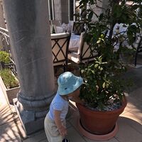 Василий был запечатлен в белой футболке, бежевых трениках, кроссовках и панаме. Мальчик стоял у большого горшка с цветком и трогал камни. Лицо ребенка было скрыто.