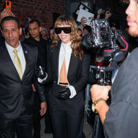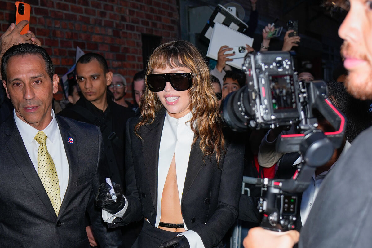 Папарацци подловили Майли Сайрус 6 мая в Нью-Йорке. Певица была запечатлена в белом топе с вырезом до груди, черном жакете, широких брюках, солнцезащитных очках, кожаных перчатках и остроносых туфлях на каблуках. Поп-исполнительнице уложили волосы в локоны и сделали макияж в естественном стиле с розовым блеском.