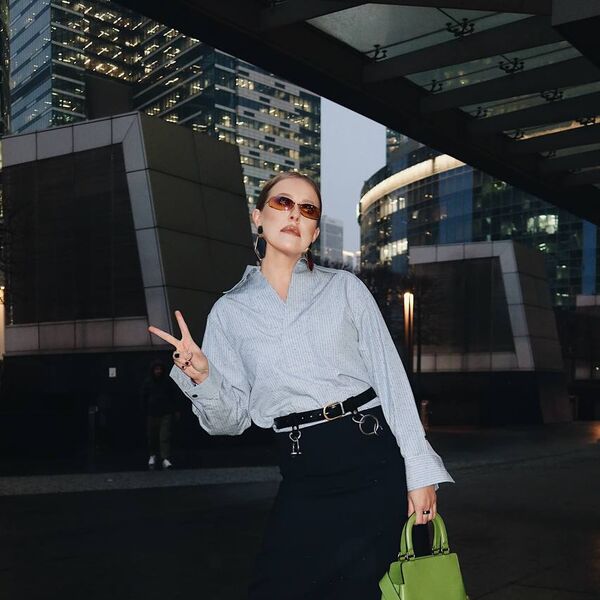 Ксения Собчак позировала в черной юбке на цепях, серой рубашке, бежевом тренче, туфлях и с зеленой сумкой. Как оказалось, образ она выбрала не случайно. Вещи были выбраны из новых коллекций люксовых брендов.