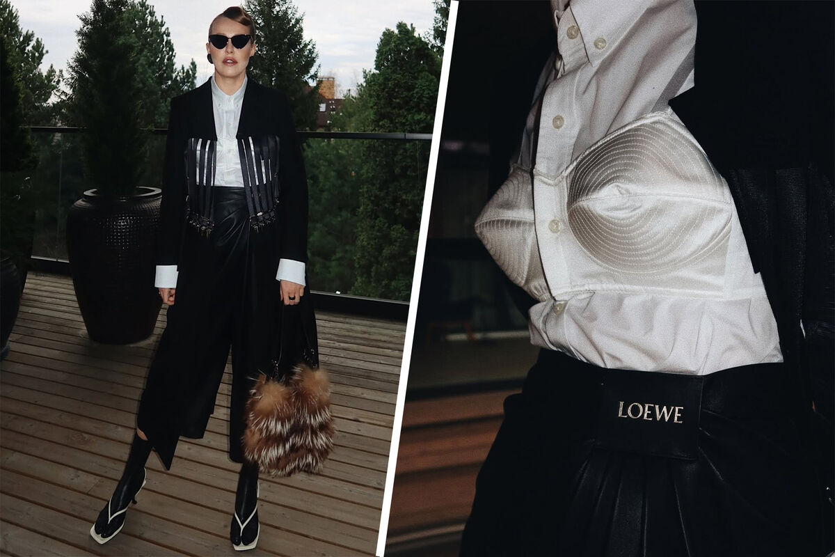 Ксения Собчак была запечатлена в белой рубашке Vaquera, поверх которой был надет атласный бюстгальтер. Журналистка дополнила образ черным укороченным жакетом Comme des Garcons, кюлотами Loewe, кожаными носками Prada, вьетнамками на каблуках The Row, массивными серьгами, солнцезащитными очками и пушистой сумкой Fendi. Знаменитости уложили волосы и сделали макияж с блеском для губ.