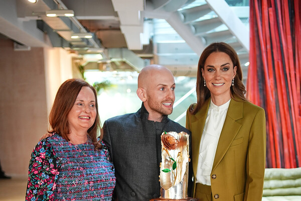 Кейт Миддлтон посетила церемонию вручения премии королевы Елизаветы II за развитие дизайна, которая состоялась 13 мая. Принцесса Уэльская вручила награду модельеру Патрику Макдауэллу. Жена принца Уильяма предстала на мероприятии в оливковом брючном костюме из весенней коллекции бренда Виктории Бекхэм, белой блузе и туфлях на каблуках. Королевская особа дополнила образ серьгами с жемчугом и кольцом. Кейт Миддлтон уложили волосы в локоны и сделали макияж с черными стрелками, коричневыми тенями и нюдовой помадой.