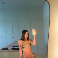 Хейли Бибер стояла перед зеркалом в крошечном бикини с анималистичным принтом. Модель позировала с распущенными прямыми волосами и макияжем в естественном стиле с блеском для губ.
