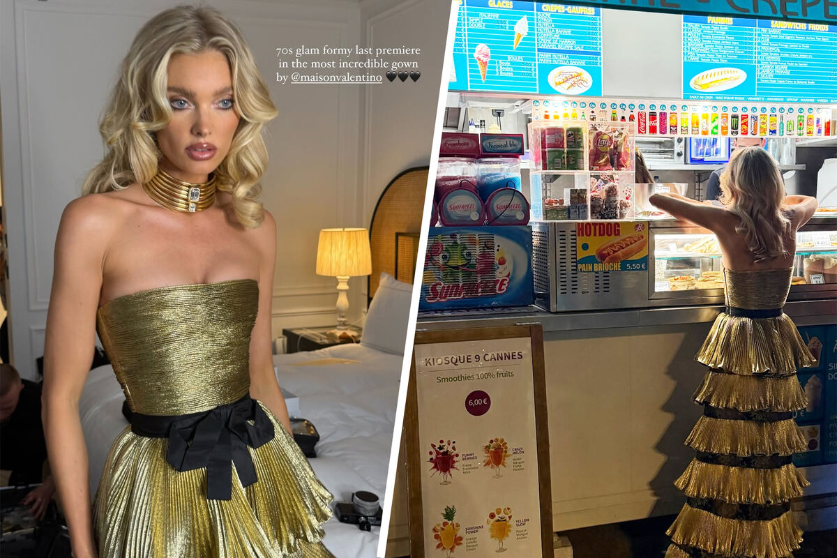 «Ангел» Victoria's Secret, модель Эльза Хоск в золотом платье купила хот-дог в Каннах. Снимками она поделилась в Instagram (владелец компания Meta признана в России экстремистской и запрещена).