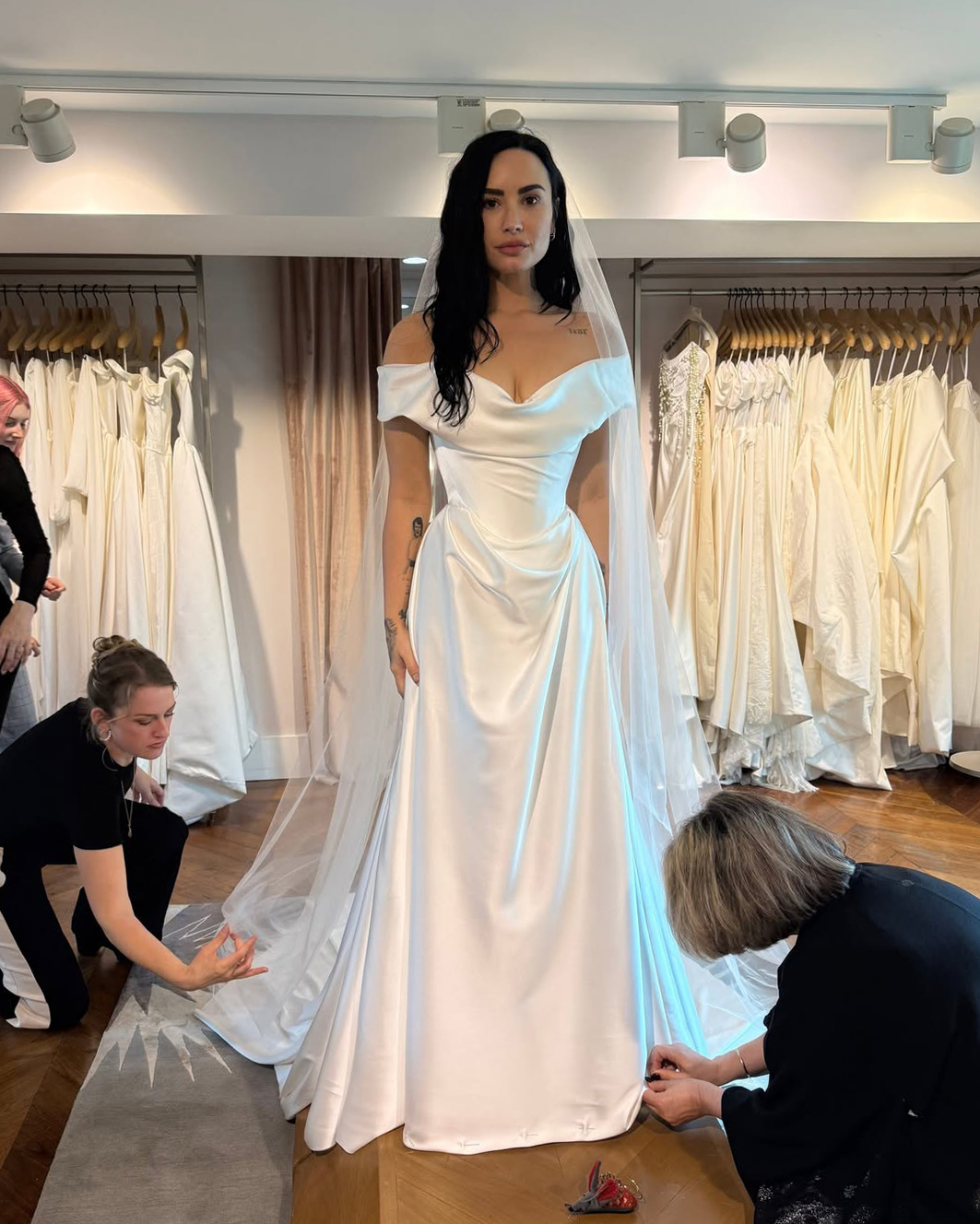 После церемонии Деми Ловато сменила наряд на платье-футляр цвета слоновой кости с драпированным корсетным верхом, которое было украшено жемчужинами. Над вторым образом невесты также работала команда бренда Vivienne Westwood.