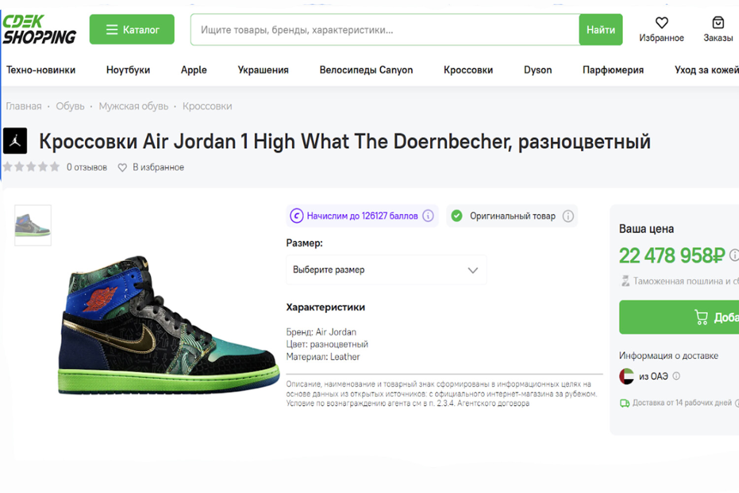 В сервисе обнаружили необычное предложение — кроссовки Air Jordan 1 High What The Doernbecher, стоимость которых составила 22,5 млн рублей. Эксклюзивная модель от Nike, выпущенная в рамках благотворительной программы, выполнена в разноцветном дизайне. Таможенная пошлина составит 2,7 млн рублей к стоимости кроссовок.