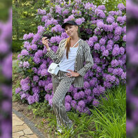 Татьяна Навка позировала в шелковом черно-белом костюме и белой майке. Образ дополнила сумка Hermes, бейсболка в стразах, кольцо с бриллиантом и серьги. Волосы она собрала в низкий хвост и сделала легкий макияж.