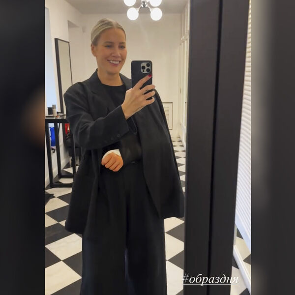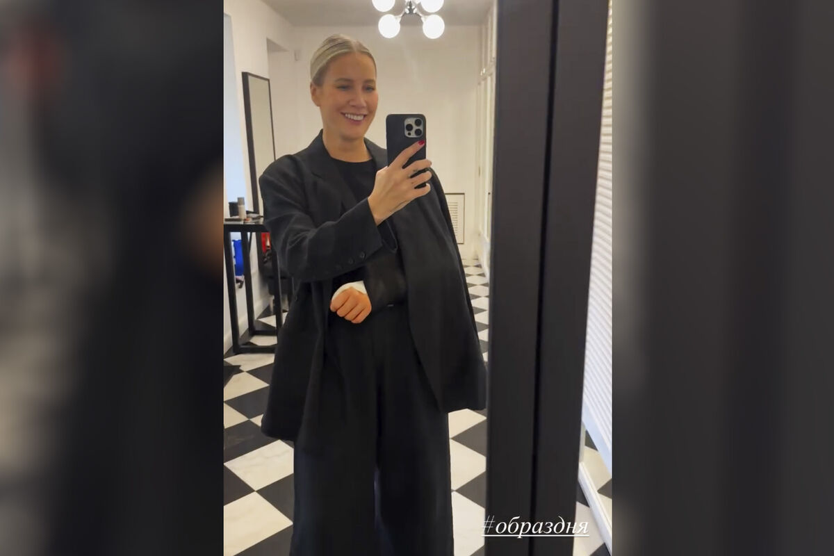 Елена Летучая позировала в черных брюках-палаццо, жакете и футболке. Волосы она собрала в пучок и сделала легкий вечерний макияж. В кадре она также показала сломанную руку, однако причину перелома не назвала.
