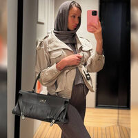 Валентина Иванова позировала в сером облегающем платье и косухе. При этом волосы модель прикрыла платком. Образ дополнила серая сумка из замши с бахромой. Она также отказалась от макияжа.
