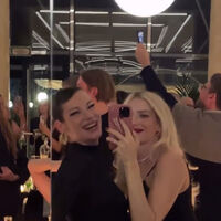 Елена Перминова предпочла для вечера черное мини-платье с подвязками и чулками. Волосы она уложила мелкими прядями и сделала макияж с красной помадой. Вместе с ней позировала беременная Ида Галич в облегающем черном платье.