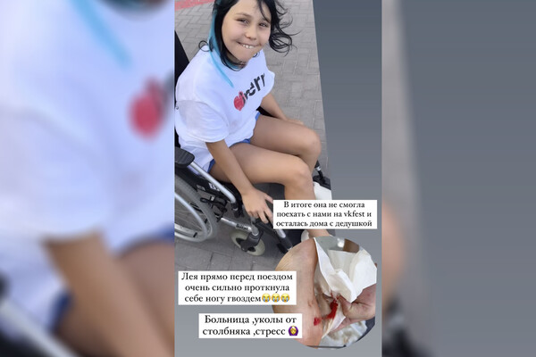«Лея прямо перед поездом очень сильно проткнула себе ногу гвоздем. Больница, уколы от столбняка, стресс. В итоге она не смогла поехать с нами на vkfest и осталась дома с дедушкой», — написала Самойлова.