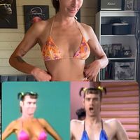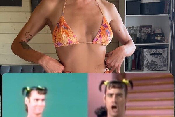 Анастасия Ивлеева была запечатлена в оранжевом крошечном бикини с розовым вкраплением. Блогерша собрала волосы в хвосты и отказалась от макияжа. Знаменитость повторила образ голливудского актера Джима Керри в купальнике.