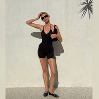 Модель Эльза Хоск снялась в черном облегающем комбинезоне. Образ дополнила сумка на ручках, солнцезащитные очки и балетки. Волосы она собрала в высокий пучок и сделала легкий макияж с блеском на губах.