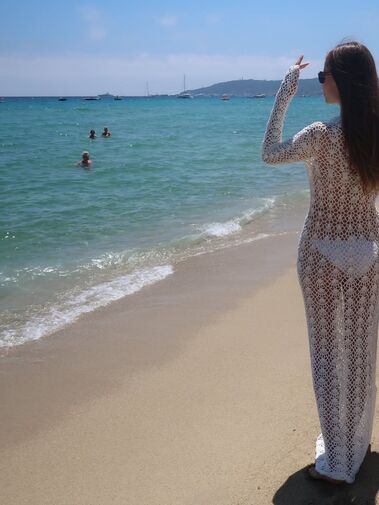 40-летняя Наташа Поли позировала в белом платье-сетке, под которое надела бикини в тон. Супермодель добавила к образу черные солнцезащитныеочки. Манекенщица стояла на пляже с распущенными волосами спиной к камере.