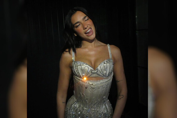 Дуа Липа вышла на сцену в серебряном корсетном боди со стразами и глубоким декольте. Волосы ей уложили прядями и сделали вечерний макияж. В образе она вышла на сцену и станцевала.