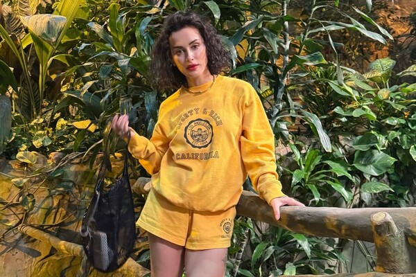49-летняя Тина Канделаки была запечатлена в желтом спортивном костюме, который состоял из толстовки с принтом и коротких шортов. Продюсер дополнила образ золотым колье Cartier в виде гвоздя, черной сумкой-авоськой, высокими носками и кедами. Знаменитость предстала перед камерой с распущенными кудрявыми волосами и макияжем с красной помадой.