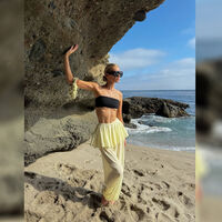 Эльза Хоск показала фигуру в черном топе-бандо и желтой юбке-брюках с баской. Образ дополнили солнцезащитные очки и плетеная сумка. Волосы модель собрала в низкий пучок и отказалась от макияжа.
