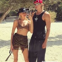 Елена Перминова была запечатлена в коричневом бикини, которое дополнила черной шляпой Miu Miu, цепочкой с кулоном, мини-юбкой в стиле милитари и кожаными сандалиями. Модель позировала с распущенными волосами и без косметики. Тарас Романов предпочел черную майку, шорты, красную кепку, солнцезащитные очки, высокие носки и кроссовки.