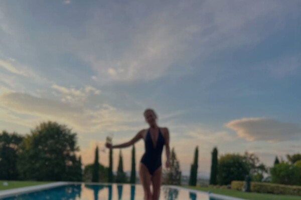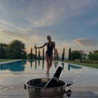52-летняя Юлия Высоцкая позировала в темном слитном купальнике на фоне бассейна на вилле. На переднем плане была запечатлена бутылка вина.