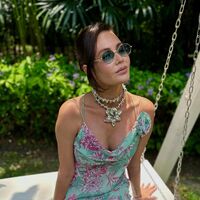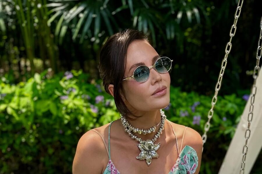 Ляйсан Утяшева предстала перед камерой в голубом платье с цветочным принтом, глубоким декольте и разрезом. Телеведущая добавила к наряду солнцезащитные очки, массивное колье с цветком, браслеты и кольцо. Гимнастке собрали волосы в гладкий пучок с прядью у лица и сделали макияж с нюдовым блеском для губ. Знаменитость рассказала, что ее образ был вдохновлен сериалом «Белый лотос».