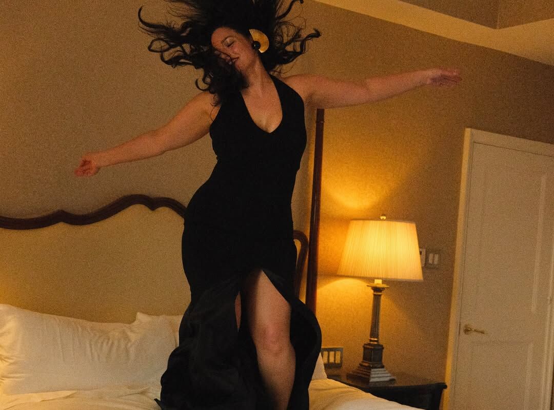 Эшли Грэм попрыгала на кровати в черном платье с глубоким декольте, открытыми плечами и разрезом до бедра. Волосы ей выпрямили и сделали вечерний макияж.