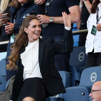 Кейт Миддлтон выбрала для спортивного мероприятия темный твидовый блейзер Ralph Lauren, белую блузу с воланами и черные брюки. Она дополнила образ золотыми украшениями.