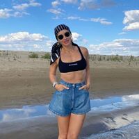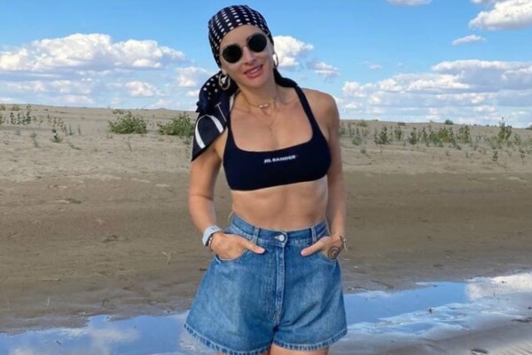49-летняя Тина Канделаки предстала перед камерой в черном топе, который сочетала с короткими голубыми шортами, солнцезащитными очками и платком на голову. Телеведущая также надела серьги-кольца, часы, браслет и ожерелье. Продюсер убрала волосы под головной убор и отказалась от макияжа. Знаменитость позировала, стоя на пляже.