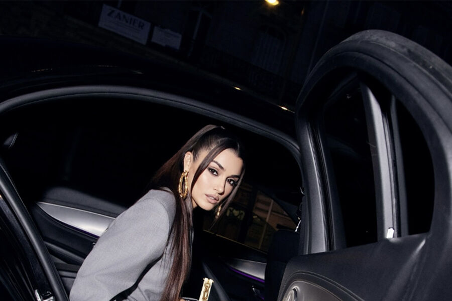 Ханде Эрчел позировала в сером мини-платье, которое дополнили акцентные розовые перчатки, золотые серьги и туфли на платформе. Волосы ей уложили крупными локонами и сделали вечерний макияж.