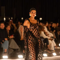 Кендалл Дженнер вышла на подиум в «голом» черном макси-платье с меховым декором и без бюстгальтера. Образ дополнили длинные перчатки, массивные золотые серьги, браслет на ноге и туфли на шпильке.