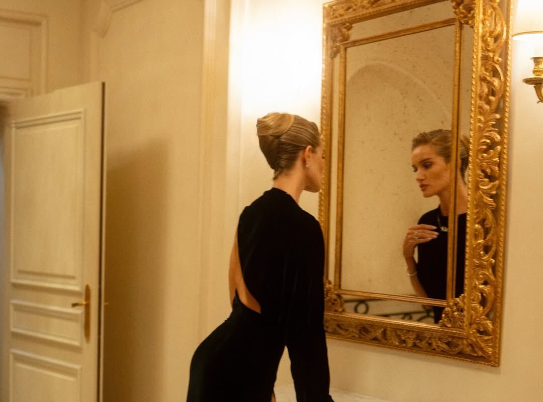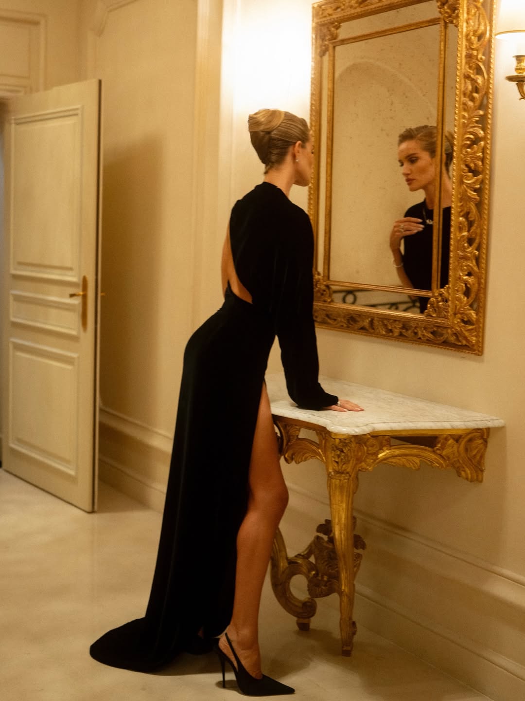 38-летняя Рози Хантингтон-Уайтли позировала в черном облегающем платье с голой спиной и разрезом до бедра. Волосы ей собрали в высокий пучок и сделали вечерний макияж. Модель позировала напротив зеркала в золотой раме.
