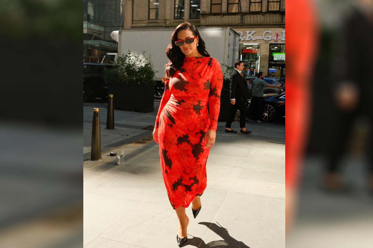 Эшли Грэм позировала в красном облегающем платье с пестрым принтом. Образ модель дополнила узкими очками и туфлями с острым мысом.