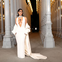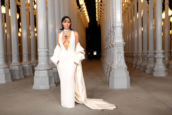 На прошлой неделе Ким Кардашьян стала гостьей гала-вечера Музея киноакадемии, который прошел в Лос-Анджелесе. Модель позировала перед камерами телесном макси-платье Maison Margiela с экстремально узким корсетом и маске. Звезда реалити-шоу добавила к образу колье с изумрудами и кольца. Позже бизнесвумен сняла маску и продемонстрировала укладку с кудрявыми волосами и макияж с черными стрелками.